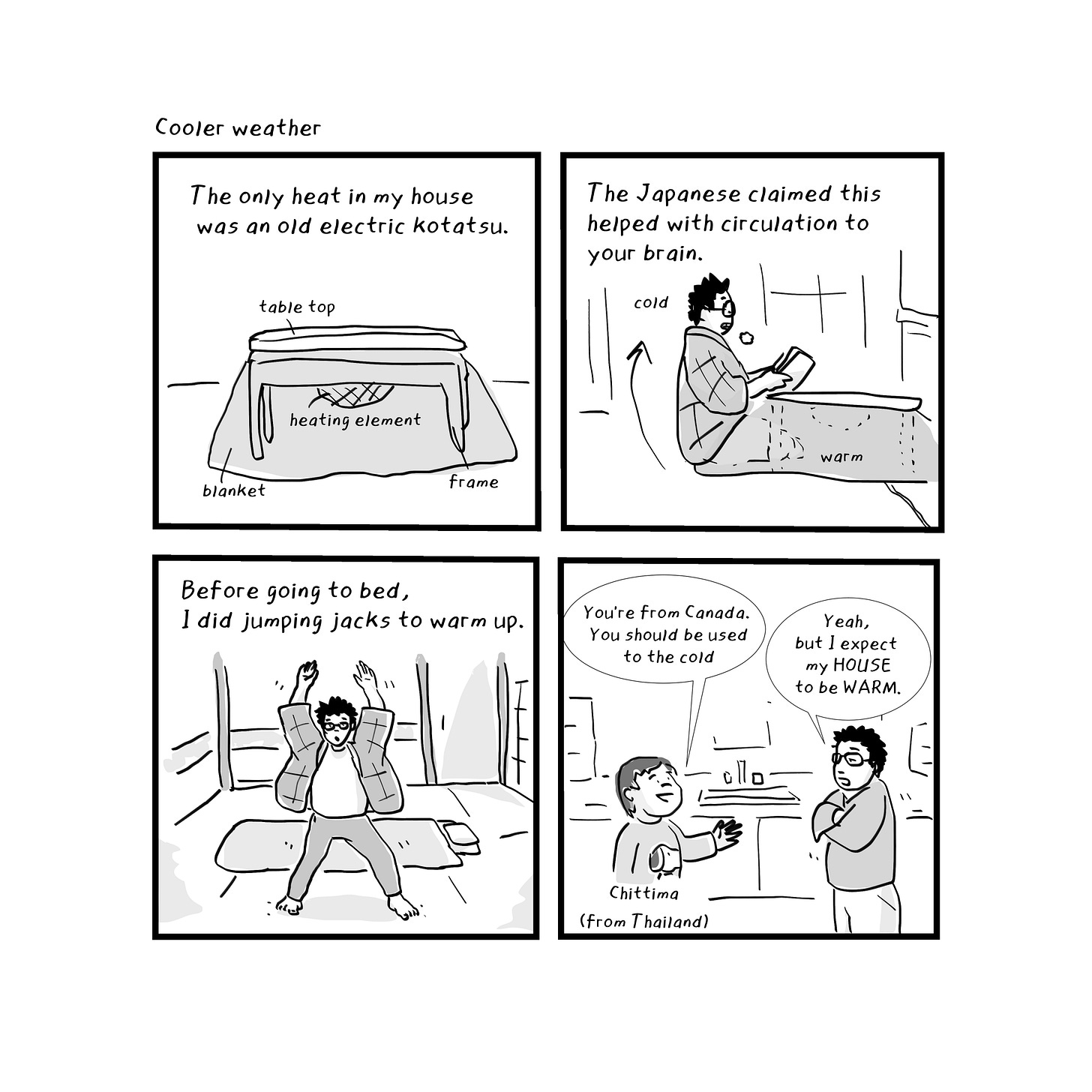 The latest instalment of my graphic memoir in progress Not Made in Japan, about my life studying marine ecology in southern Japan during the late 1980s. The latitude of Tomioka is about 32.5 N, which is in the ball park of New Mexico or Algeria, so pretty warm. In the winter, it only occasionally got below 0 C, but still, it could be kind of chilly indoors if you are too cheap to buy space heaters like me. I was young and had a higher metabolism then. I still have the hanten padded house coat I used to wear.