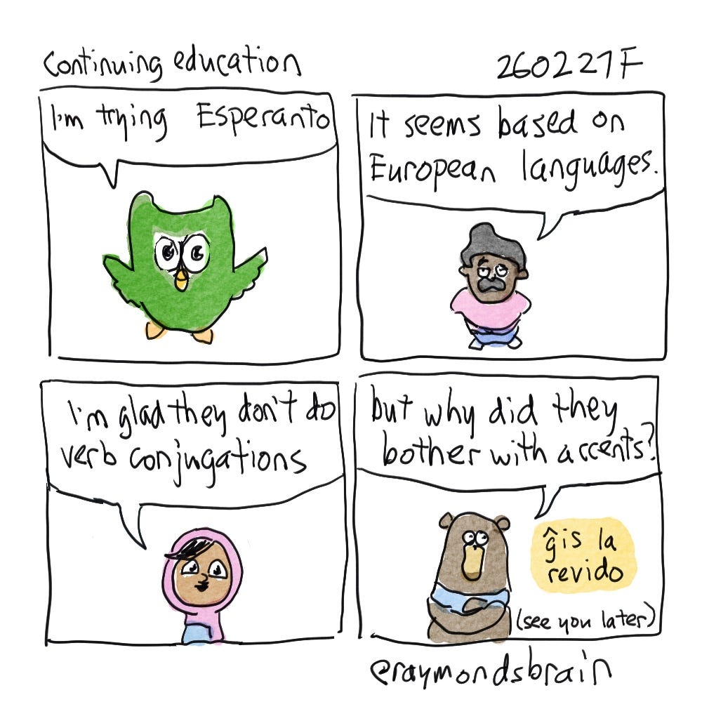 Duolingo gamifies language learning. I am not sure how useful it is for language learning, but I figured it might be marginally better than spending it on social media. I just started, but it was interesting to get a sense of its structure. I thought they would have gotten rid of some of the inconvenient bits like accents. Why don’t they just use a j instead of a g with an accent? I met a Japanese woman once who said her father studied Esperanto and her name was related to that.
