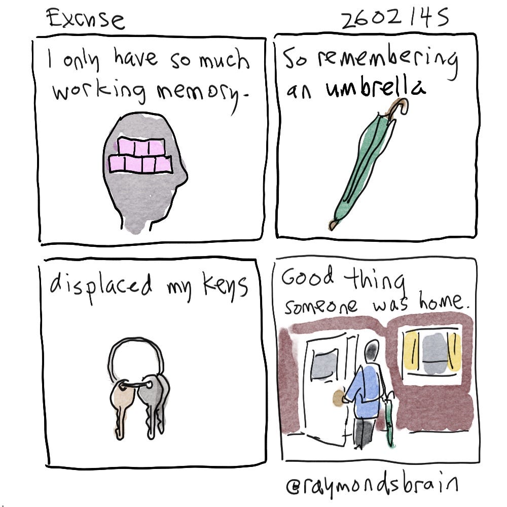 I try to make certain actions routine so that I don’t have to think about them, but then if something is a little different, I get thrown off because I’m not thinking that carefully about them. I might like an AI to keep track of things I don’t want to think about. When I was done with tai chi class, I couldn’t find my keys or my fanny pack. I had to hope that I had forgotten them at home. Fortunately, they were at home and even more fortunately, my daughter was also home so that I could get in.