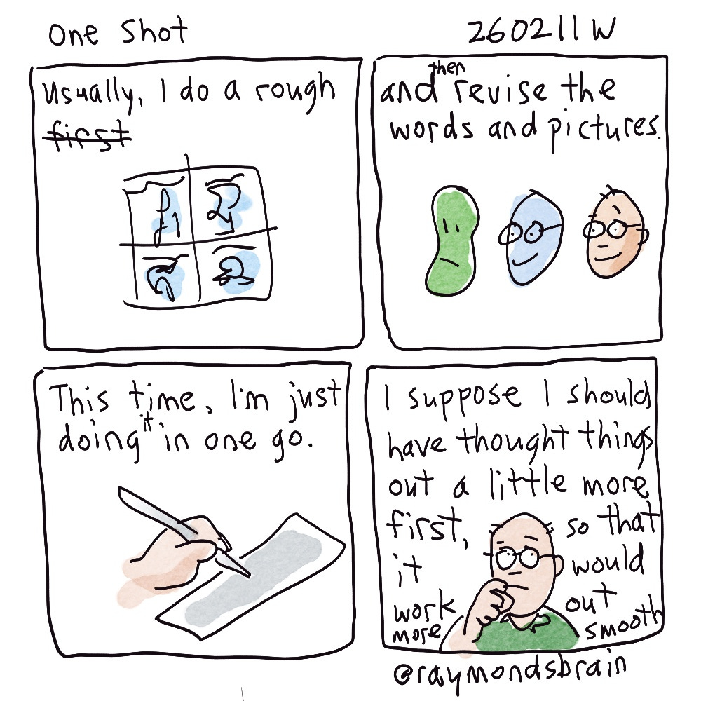 I had been chatting with a friend about movies or TV series that are done in a single shot. This made me wonder about doing a comic without making any changes. This kind of defeats the purpose of using an ipad, because I like having layers and being able to erase lines. If you draw in pen on paper, you have just start over or make the best of it. I suppose this is more like life itself, where you don’t really get a do over.