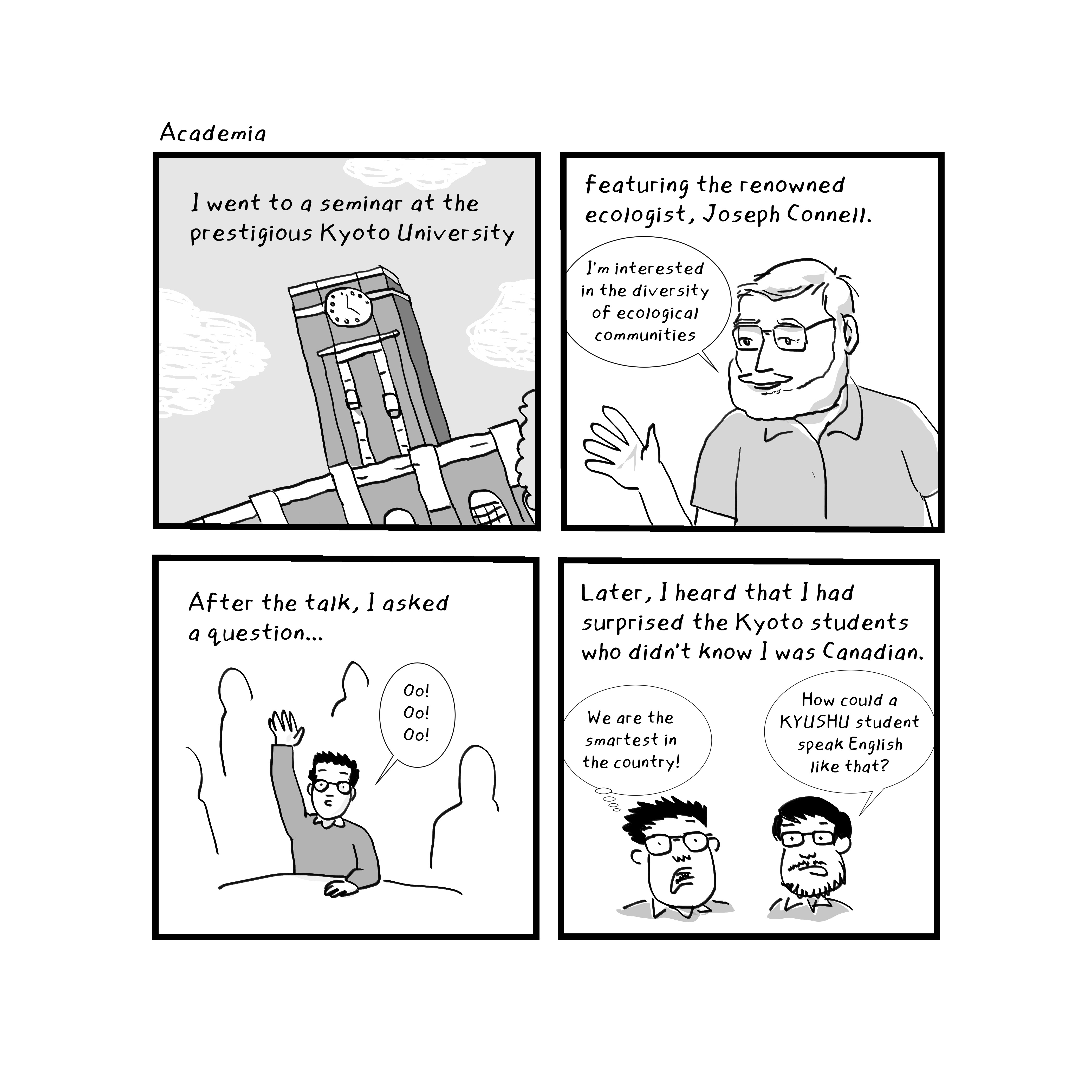 Another episode in my graphic memoir in progress Not Made in Japan about my life a graduate student in southern Japan in the late 1980s. I had read some of the papers by Joseph Connell and he was an important scientist in seashore ecology and the role of disturbance on the diversity of ecological communities, so meeting him was a big deal. Kyoto University is one of the Imperial universities, as was Kyushu University, but it was extra hard to get into. English is a struggle for Japanese students, though in science at least, they had to write their thesis in English. Since I looked Japanese, I could look like a genius for speaking the language I had grown up with, until they heard my Japanese.