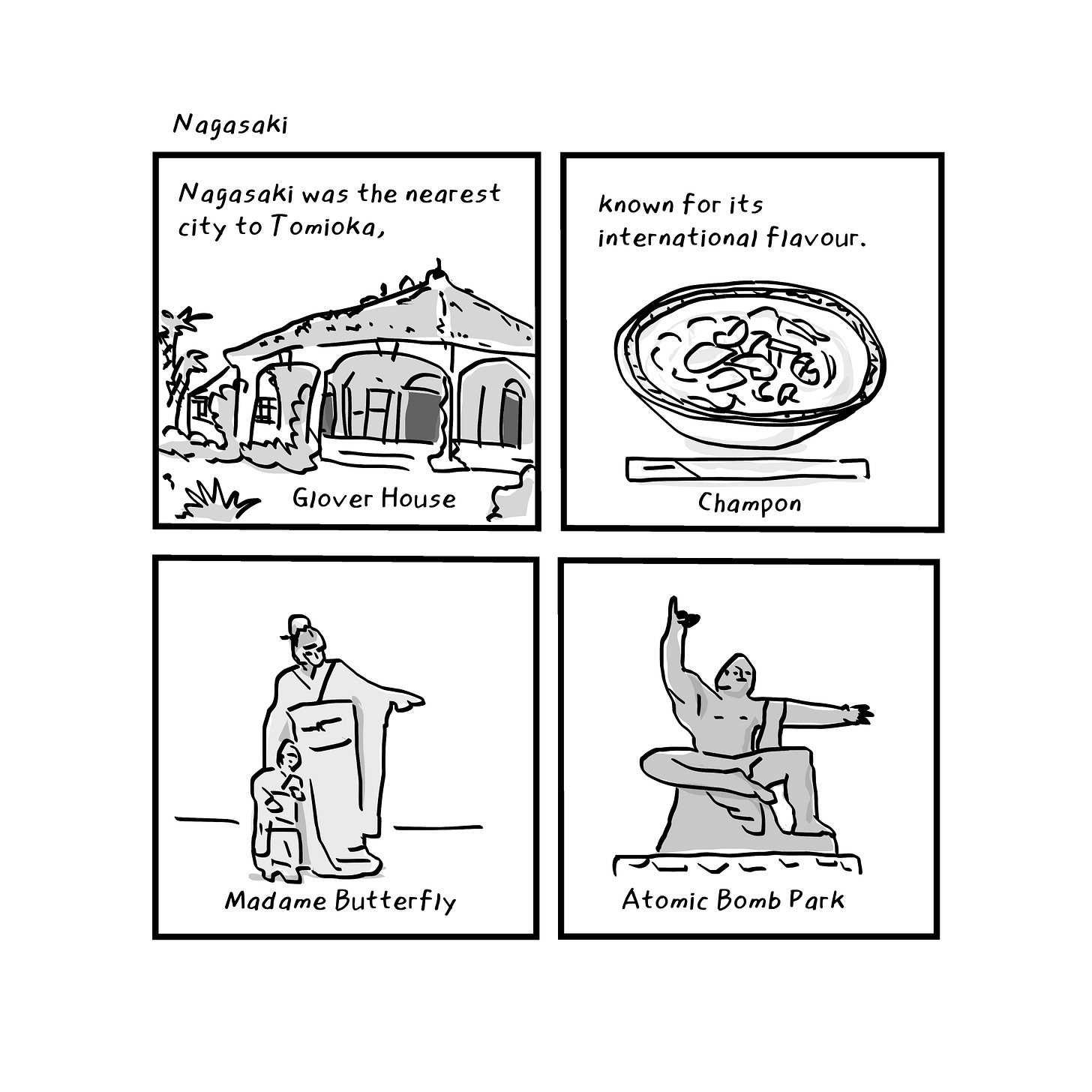 This is my latest instalment of my graphic memoir in progress, Not Made in Japan, about my experiences studying marine biology in southern Japan in the late 1980s. This 4 panel approach might not be so suited for this kind of long form story, but I will carry on for now to see how it works out. I happen to be reading a book called The Ten Thousand Autumns of Jacob de Zoet, by David Mitchell, which is set in Nagasaki around 1800, featuring a a Dutch trader.
