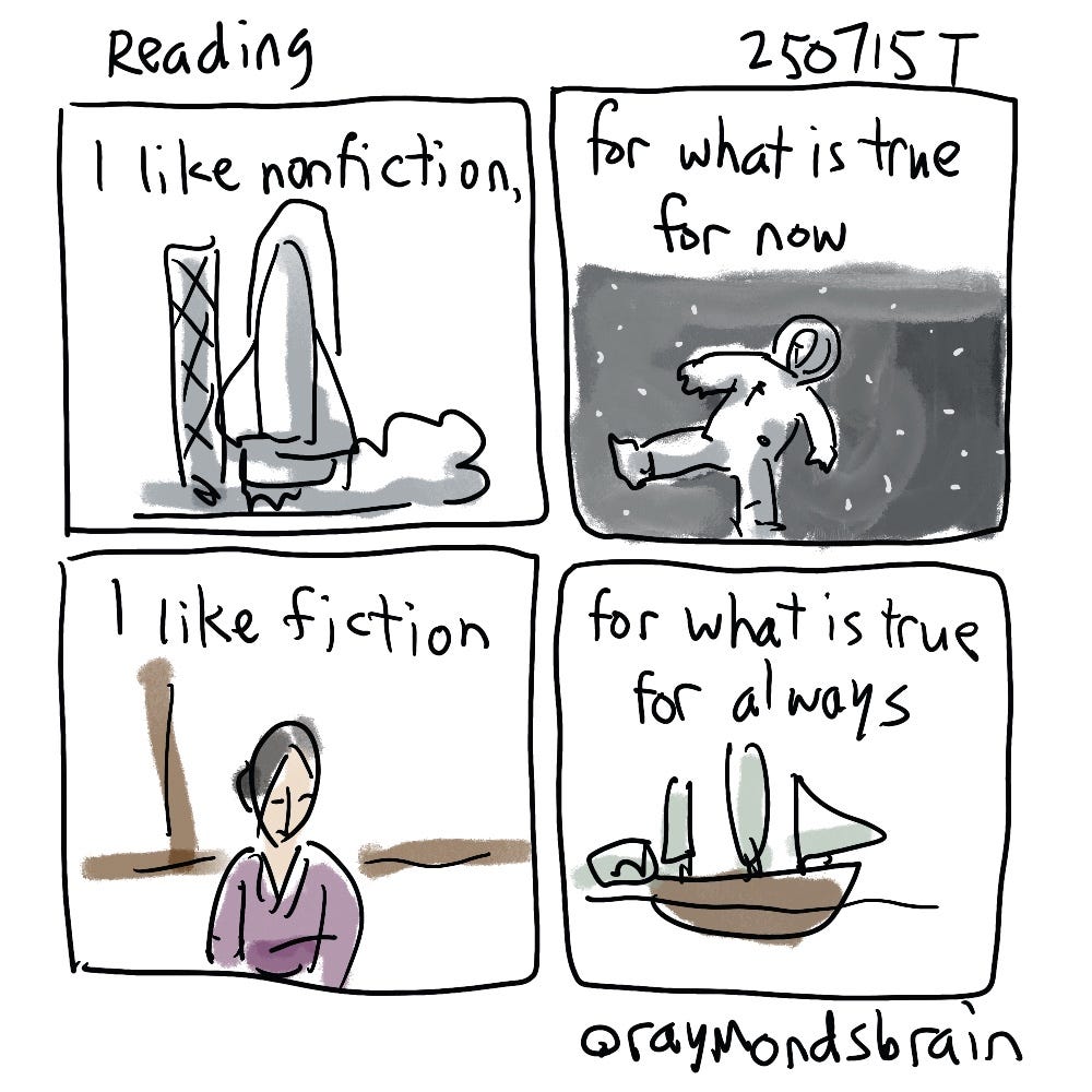 I am just referring to what I would consider good nonfiction and fiction. This is probably an oversimplification, but I happened to be thinking about reading. Nowadays with so much misinformation floating around, it seems that figuring out what is real is becoming more difficult. I tend to read nonfiction during the day, in case I want to take some notes. I listen to fiction through audiobooks, because I usually listen while washing the dishes so I can’t be taking notes and I like the feel of being told a story. And I read fiction in the evening. What are your reading habits?