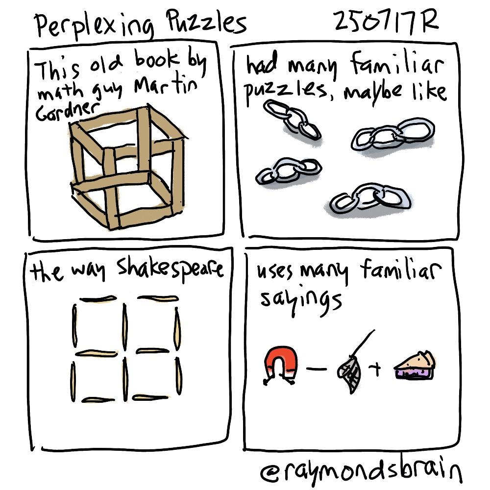 This illustrated book is actually a combination of two volumes by Martin Gardner who wrote about lots of these kinds of things, a mixture of puzzles and curiosities. When I worked at Science World, I was in charge of the puzzle area, which made me more curious about them. But I am not that good at them and have not yet learned how to do a Rubik’s cube. If you haven’t seen these before, the first one was just an example of an impossible figure. The second was about making a single loop by opening and closing only three links. The third is to move three toothpicks to make three equal squares. And the fourth is the name of a bird.
