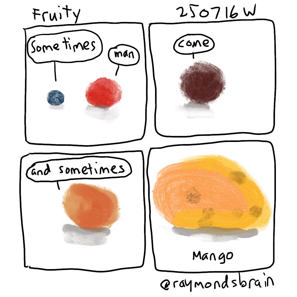 I like summer for all the fruit available. The blueberry and raspberry came from our garden. We had bought the cherries and apricots that I think come from somewhere in BC. And my partner’s aunt brought over a box of mangos from Costco. I’d just seen a video about making pictures by laying down the colour first and then outlining. I usually out line first, but then I liked the colours as they were and thought of something for the fruit to say.