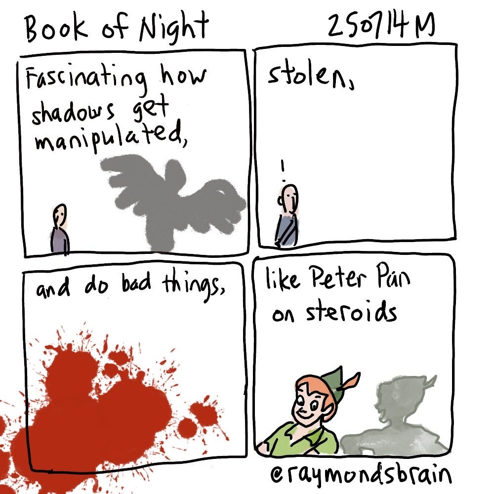 I enjoyed this fantasy by Holly Black. Apparently her other work has been for younger readers, but this one seems to be for adults, even though I was reminded of Peter Pan. I’m not sure I’ve actually seen the Disney Peter Pan, but somehow I was aware of his shadow incident. The protagonist of Book of Night is a young woman with an interesting mix of talents and shortcomings.