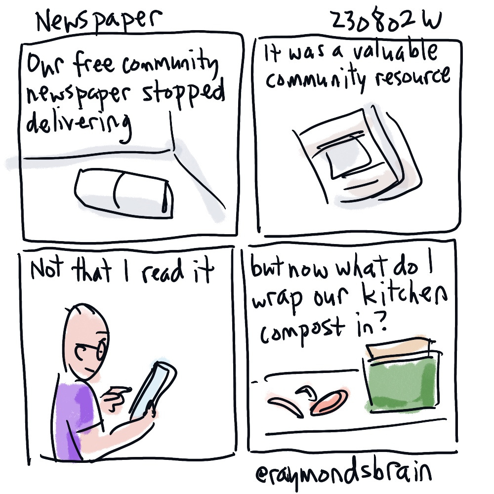 Wednesday's Newspaper. We used to live in Coquitlam, and the Tri-City News is turning totally digital on Aug 10th. I told my sons, who I used to help deliver the newspaper, that now they can start feeling old. And when they have kids, they can tell their children "when I was young, I used to deliver papers to the neighbours' porch"